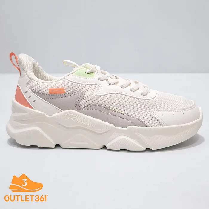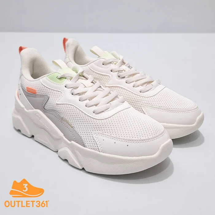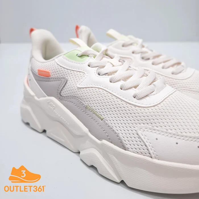 این کفش با رنگبندی روشن و ملایم (ترکیب سفید، خاکستری روشن و جزئیات نئون نارنجی و سبز) طراحی شده تا هم برای استایل روزمره و هم برای استفاده طولانیمدت مناسب باشد. رویه کفش از پارچه مش تنفسپذیر و الیاف مصنوعی مقاوم ساخته شده که گردش هوا را به خوبی برقرار میکند و باعث میشود پاها در طول روز خشک و خنک بمانند.